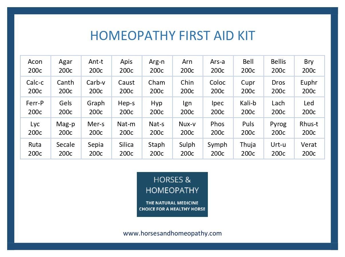 First Aid Kit of 50 remedies for Horses developed by Horses and Homeopathy. The kit contains 2gm/1dram clear glass bottles , each containing approximately 150 sucrose No 2 pillules/pellets.